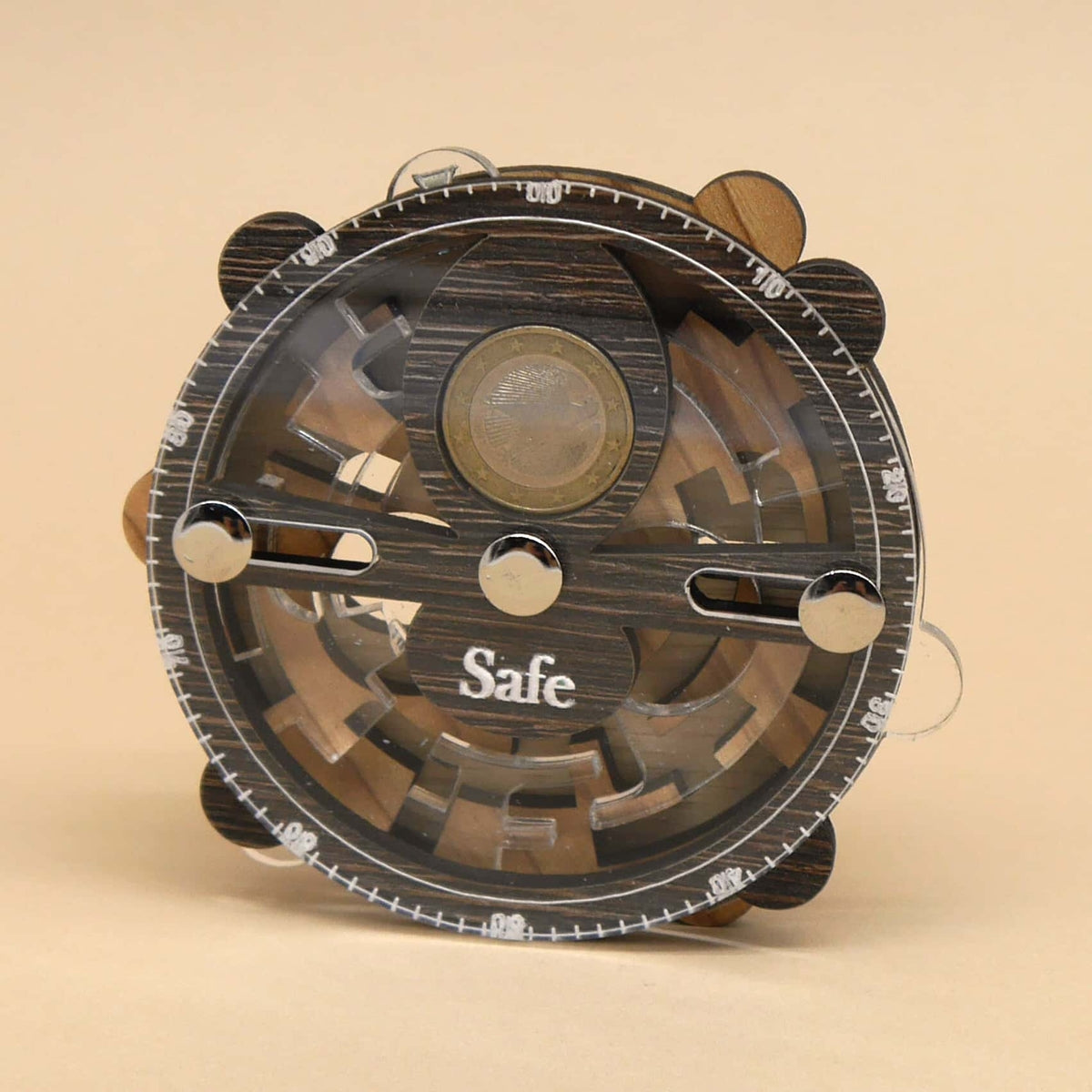 Das Drehpuzzle SAFE von Siebenstein Spiele ist ein faszinierendes 3D Puzzle, das nicht nur Geschick, sondern auch Köpfchen erfordert. Dieses liebevoll handgefertigte Denkspiel besteht aus zwei übereinanderliegenden, raffiniert gestalteten Labyrinthen, die nur durch präzises Drehen miteinander in Einklang gebracht werden können. Im Inneren befindet sich eine echte Münze – gefangen wie ein Schatz im Tresor. Ziel ist es, diese Münze zu befreien, indem man die beiden Labyrinthe so geschickt bewegt, dass sich die Wege der Metallstifte öffnen und den Weg freigeben.