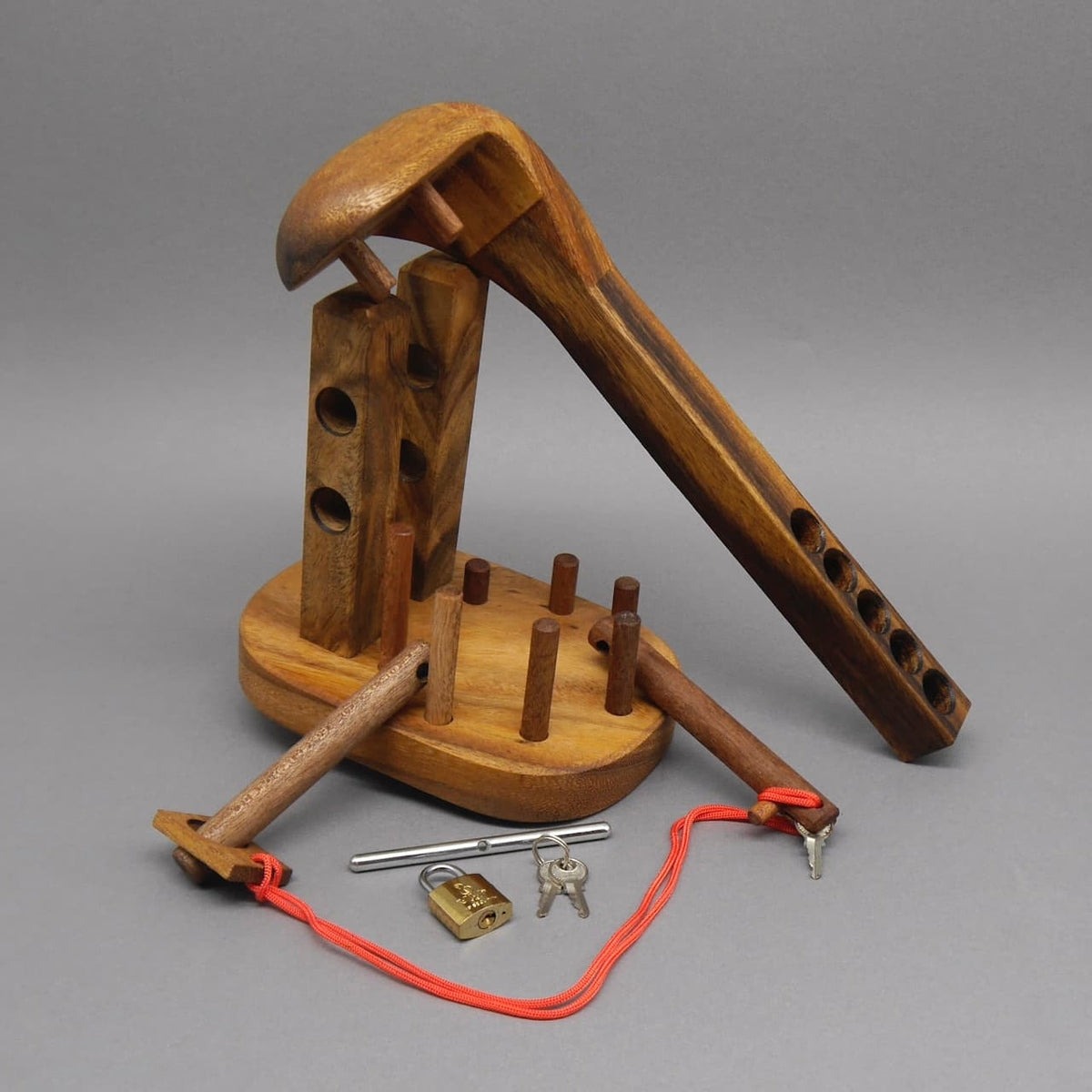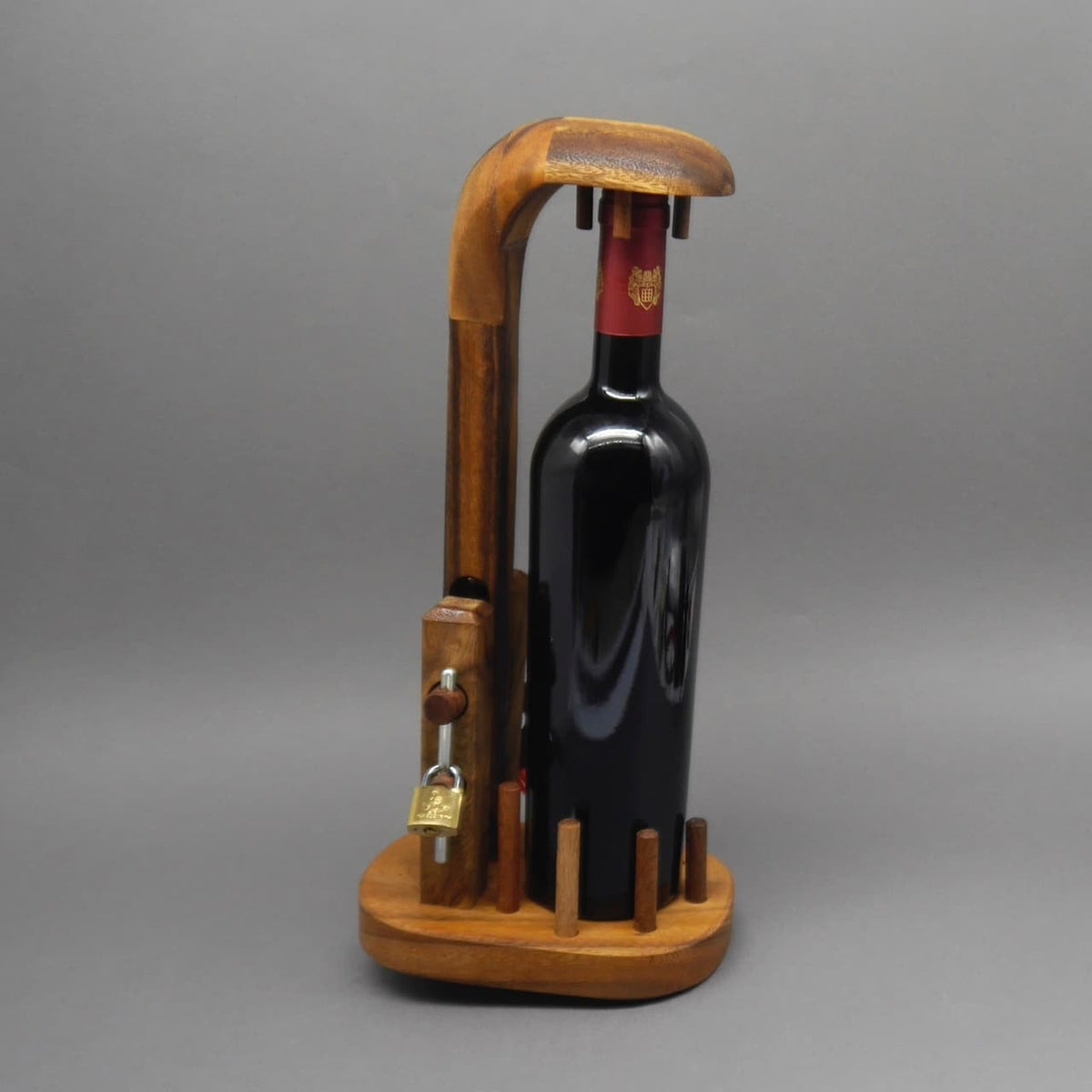 Der Flaschentresor BOTTLE IN JAIL von ROMBOL Denkspiele ist eine originelle und knifflige Geschenkidee für Weinliebhaber, Rätselfans und alle, die gerne kreativ verschenken. Dieses „Gefängnis“ für Wein oder Flaschen anderen Inhaltes ist schon gemein – und genau das macht den Reiz aus! Ein massives Schloss verschließt mit einem stabilen Stahlstift zwei passgenaue Holzbolzen. Der Clou: Den Schlüssel für das Schloss findet man nicht einfach so. Er steckt auf der anderen Seite, fest eingeklemmt in einem der Holzbolzen und zusätzlich mit einem Seil gesichert. Der Beschenkte muss also durch geschickte Denkarbeit und ein wenig Geduld den Schlüssel befreien, um das Schloss zu öffnen. Erst wenn der Stahlstift entfernt ist, lassen sich die Bolzen herausziehen – und die Flasche wird „befreit“.