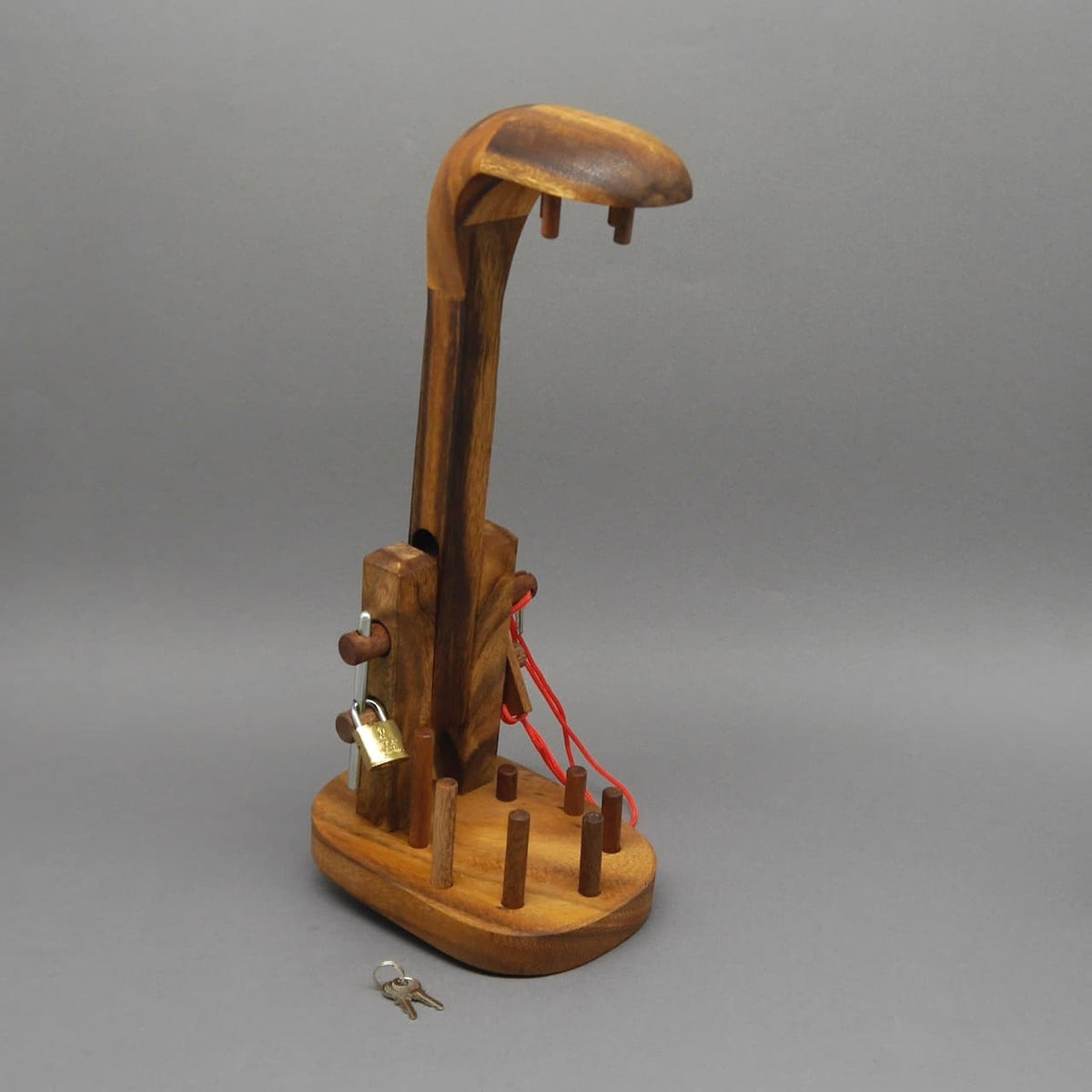Für den Schenkenden ist ein kleiner Komfort eingebaut: An dem Schloss befindet sich ein Zweitschlüssel, mit dem sich die Flasche einfach einstellen lässt, ohne das Seilpuzzle zu lösen. Diesen kann man natürlich zum nächsten Geburtstag oder einer anderen Gelegenheit feierlich „nachreichen“.