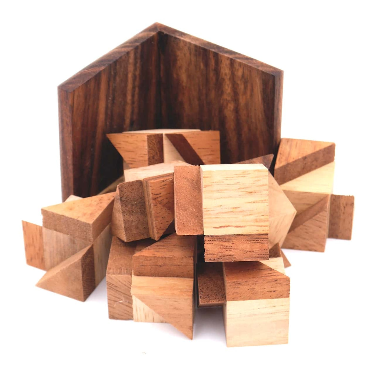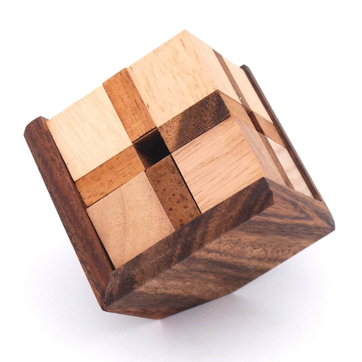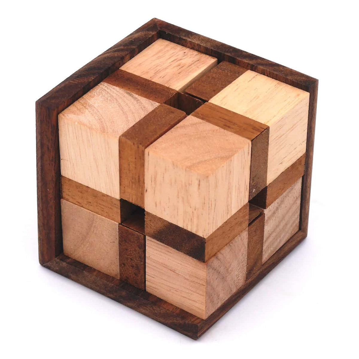 Ansprechendes und aufwendig gestaltetes 3D-Puzzle mit 8 komplexen Holzwürfeln. Entnehme die 8 einzelnen Würfel aus dem Holzrahmen und setze den Würfel wieder zusammen. Beachte dabei das dunkle Gittermuster auf allen Seiten des Würfels. Eine anspruchsvolle Aufgabe!