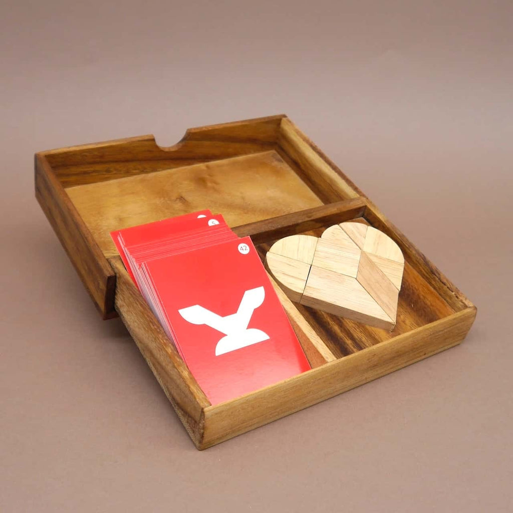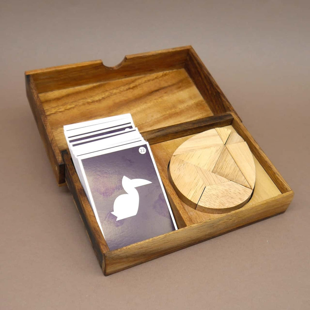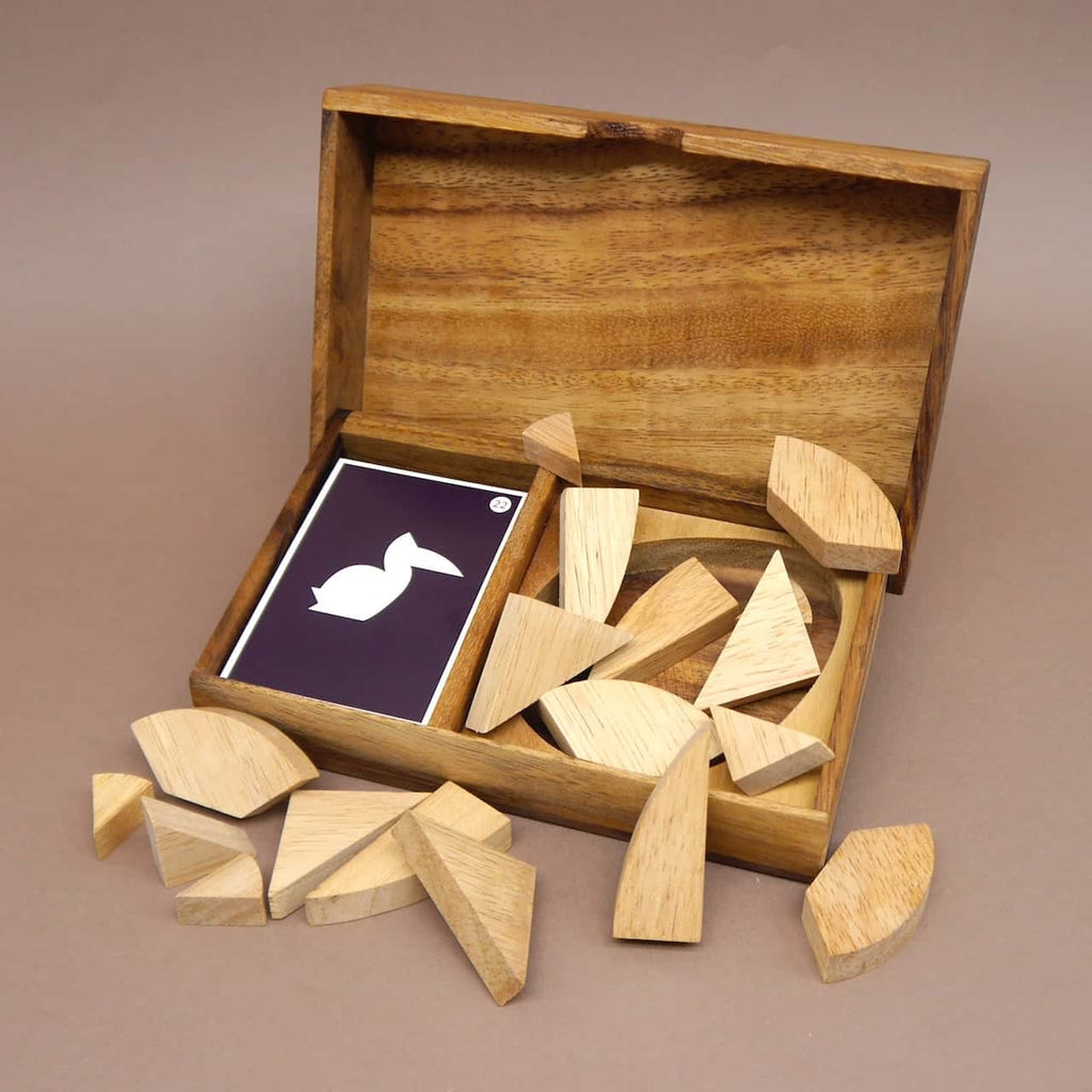 Die Herausforderung besteht darin, die Holzteile in einer Ebene zu zweidimensionalen Figuren zusammenzulegen. Dabei dürfen die Steine weder hochkant gestellt noch überlagert werden. Dies erfordert Geschick und räumliches Vorstellungsvermögen.