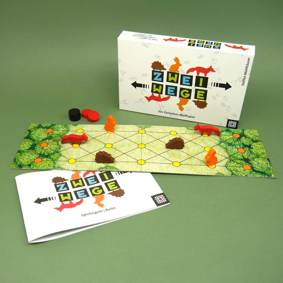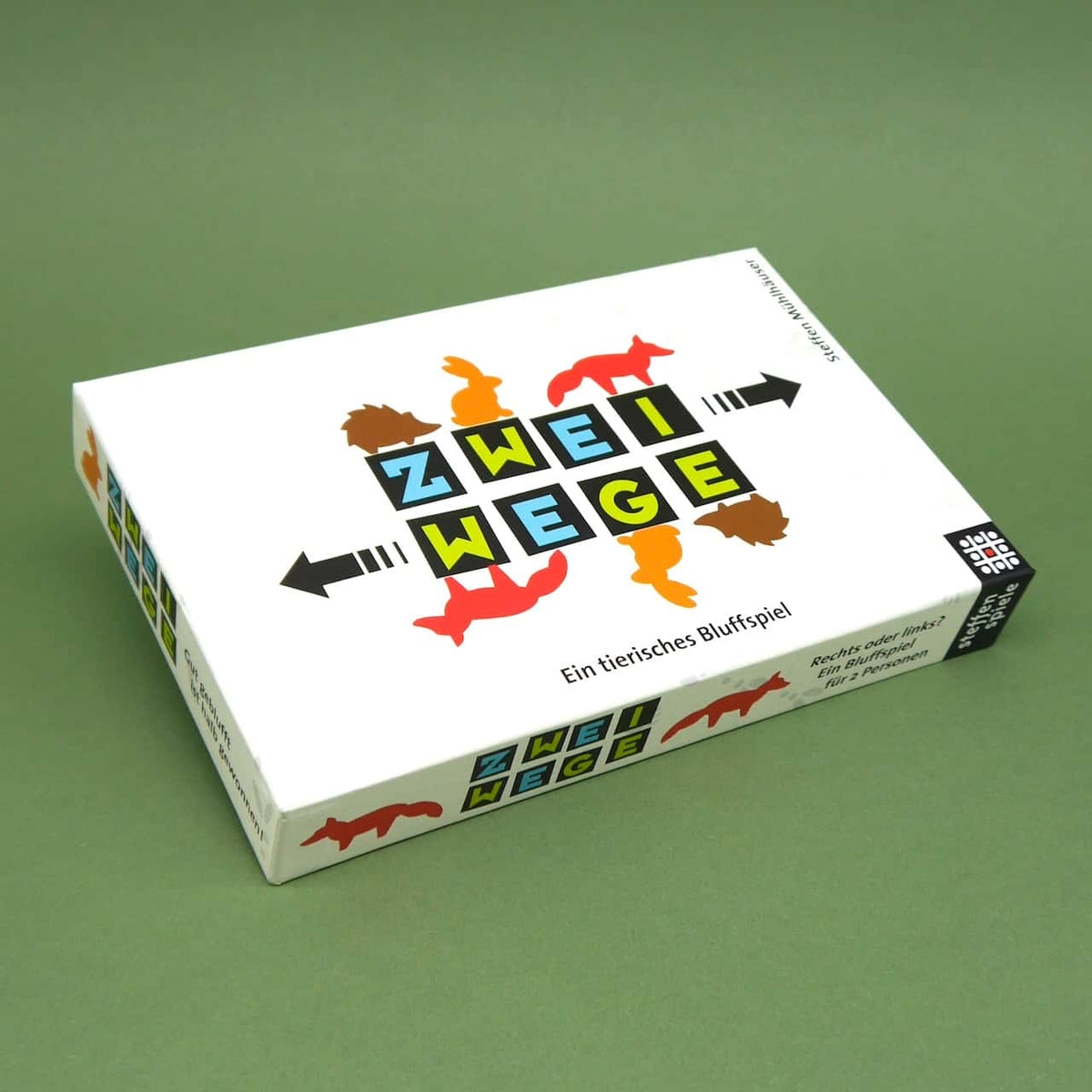 Das Gesellschaftsspiel ZWEI WEGE ist ein echtes Duell für zwei Personen. Jeder Spieler übernimmt drei Tiere und muss sie mit List und Tücke ans andere Ende des Spielfelds bringen. Das Besondere: Die Bewegungsrichtung wird verdeckt gewählt – und es gibt immer nur zwei Wege zum Ziel. Die Herausforderung besteht darin, den Weg zu wählen, den der Gegner nicht blockiert. Hier sind Intuition, Bluff und eine gute Portion Psychologie gefragt.