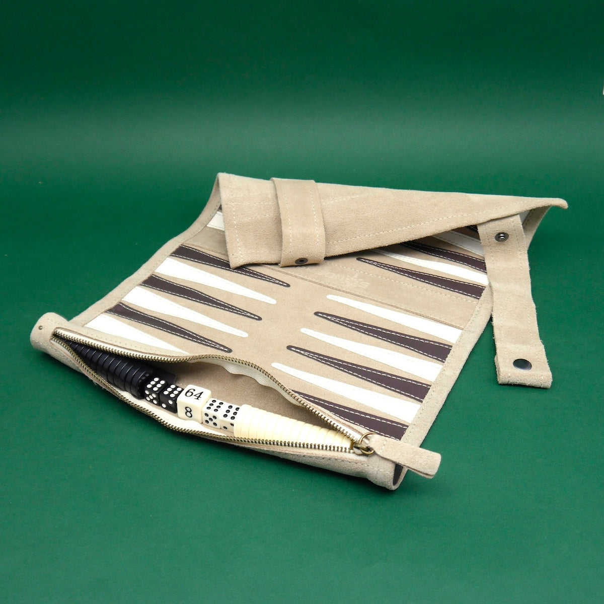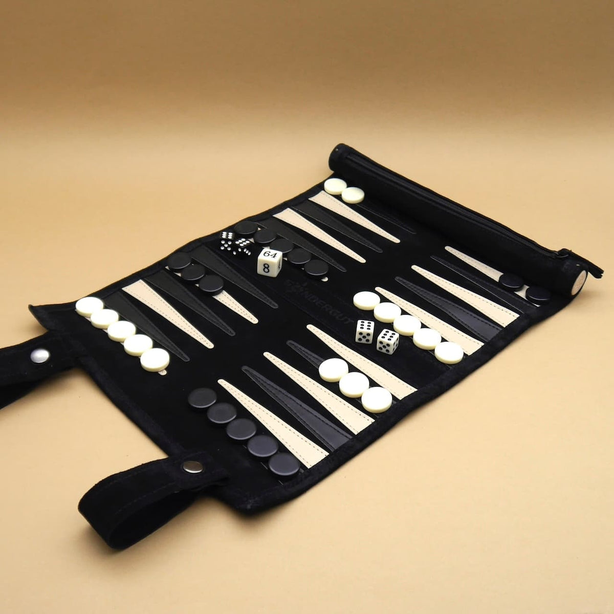 Das edle Reise Backgammon zum Ausrollen von Sondergut ist ein stilvolles Würfelspiel für unterwegs, das durch sein einzigartiges Design begeistert. Gefertigt aus hochwertigem Leder ist es nicht nur ein Spiel, sondern auch ein echter Hingucker – ob auf Reisen, beim Picknick, im Urlaub oder gemütlich auf der Terrasse. Das Reisespiel lässt sich besonders leicht transportieren und platzsparend verstauen: Ausgerollt misst das Spielfeld ca. 25 x 32 cm, zusammengerollt gerade einmal 25 x 5 cm. Damit passt es problemlos in jeden Rucksack, jede Tasche oder auch ins Handgepäck.
