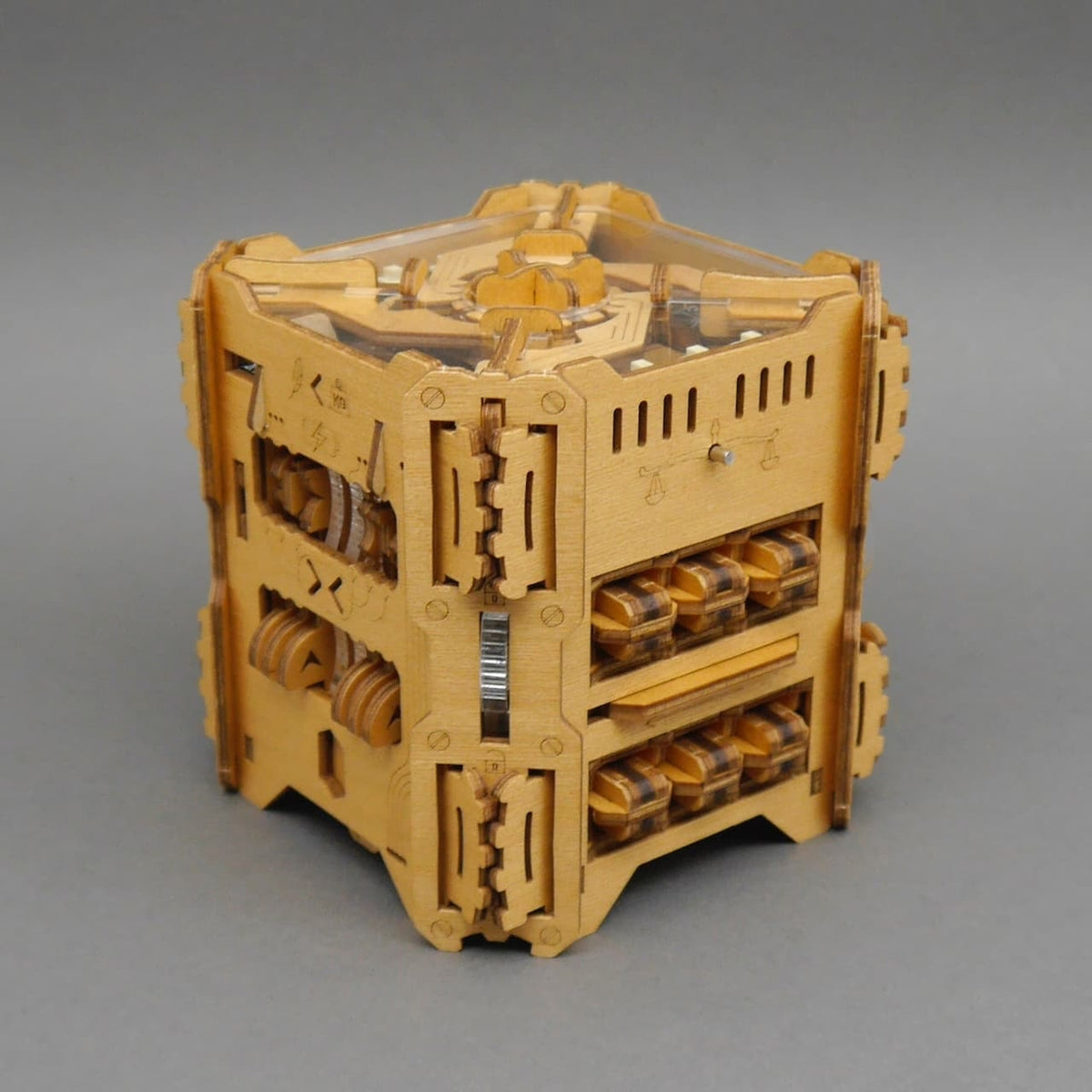 This high-quality wooden puzzle consists of birch plywood, acrylic, stainless steel and electronic components, and takes you on a 120–180 minute adventure full of clever tricks, hidden mechanisms and amazing interactions.
