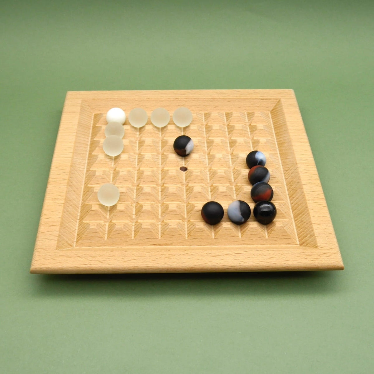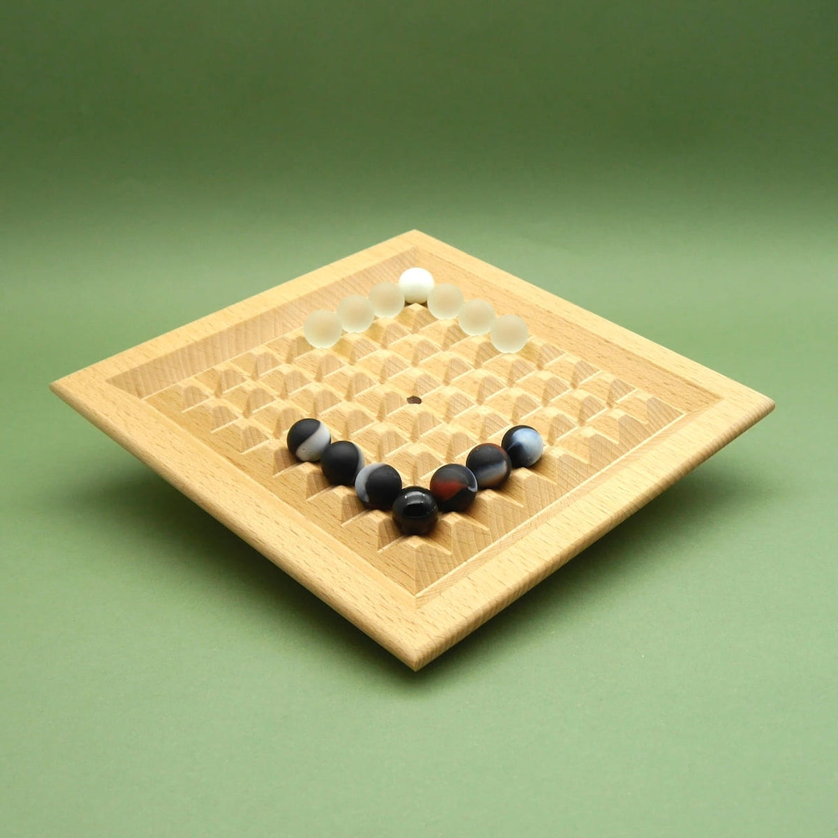 The game board is presented in the usual high-quality wood from Gerhards Spiel und Design. The finely crafted surface allows for precise movement of multiple marbles simultaneously. This makes every game an exciting and aesthetically pleasing experience. 90 GRAD is a game for anyone who enjoys tactical thinking, strategic planning, and being captivated by elegant simplicity – and who always wants to think outside the box .