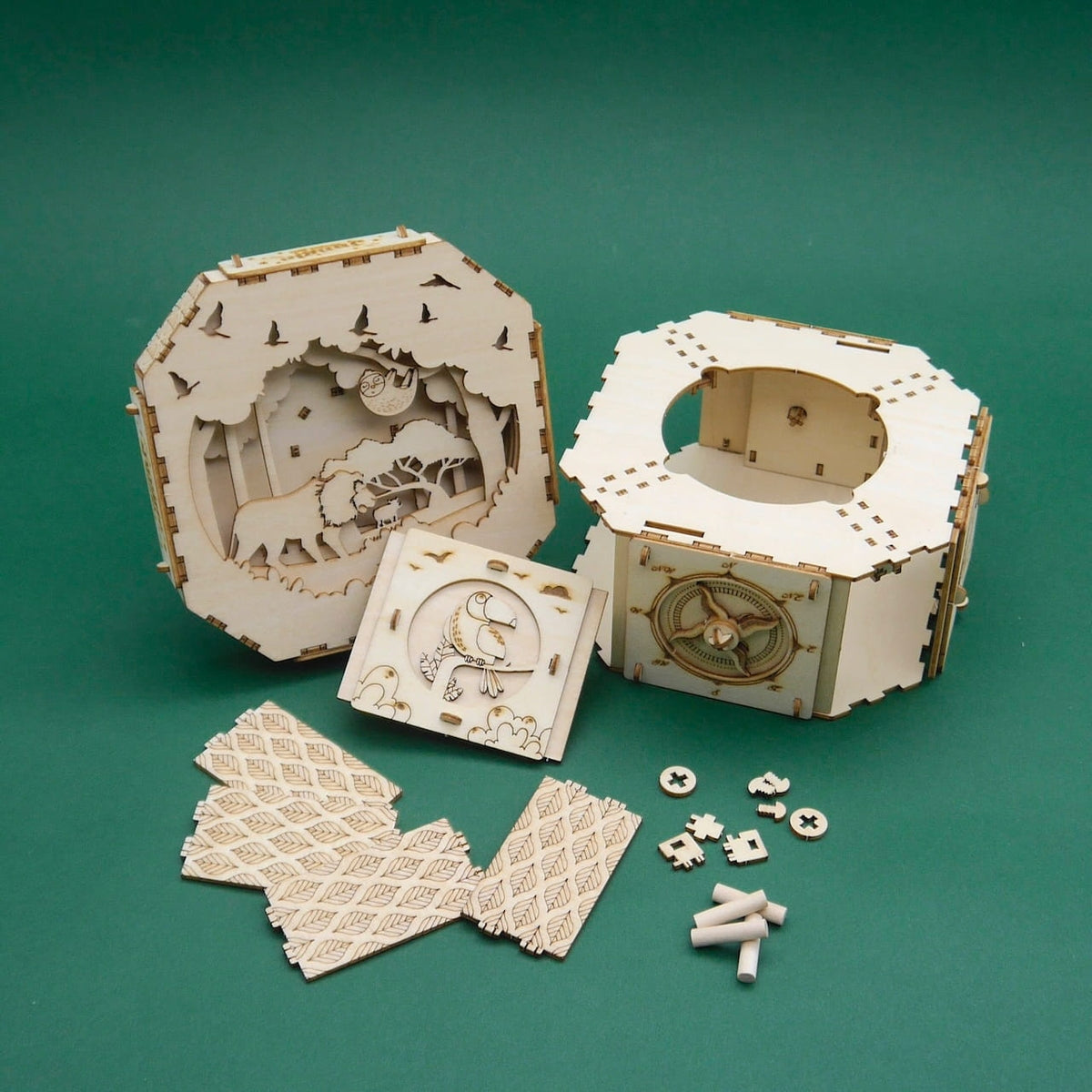 Once assembled, this box, made of laser-cut precision wooden parts, transforms into a stable, functional storage box with a clever secret lock.