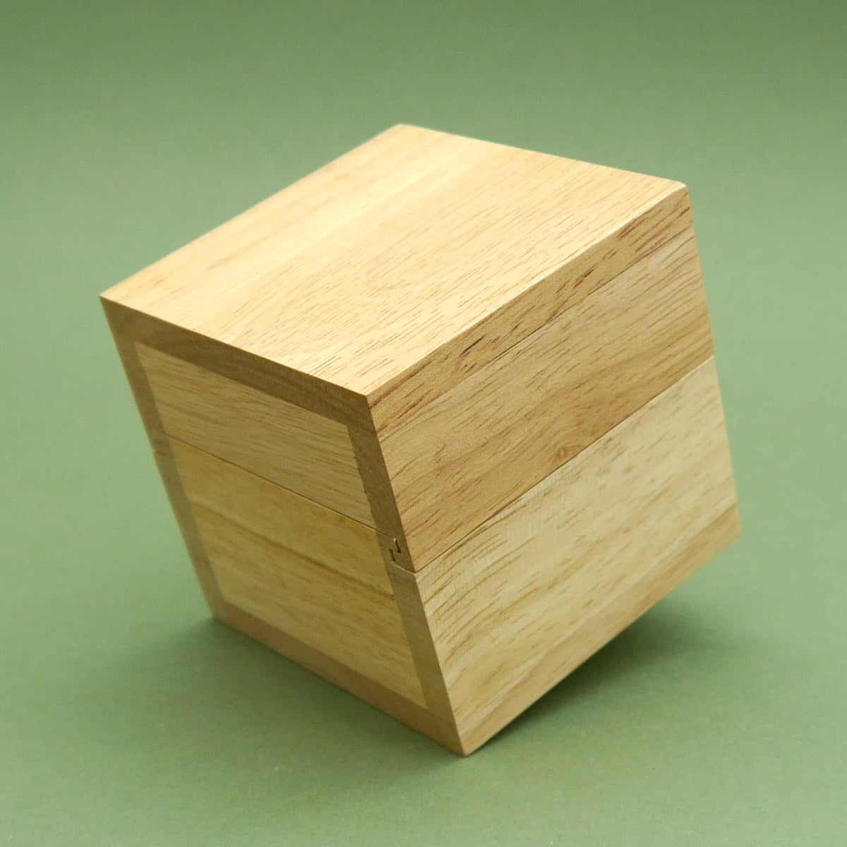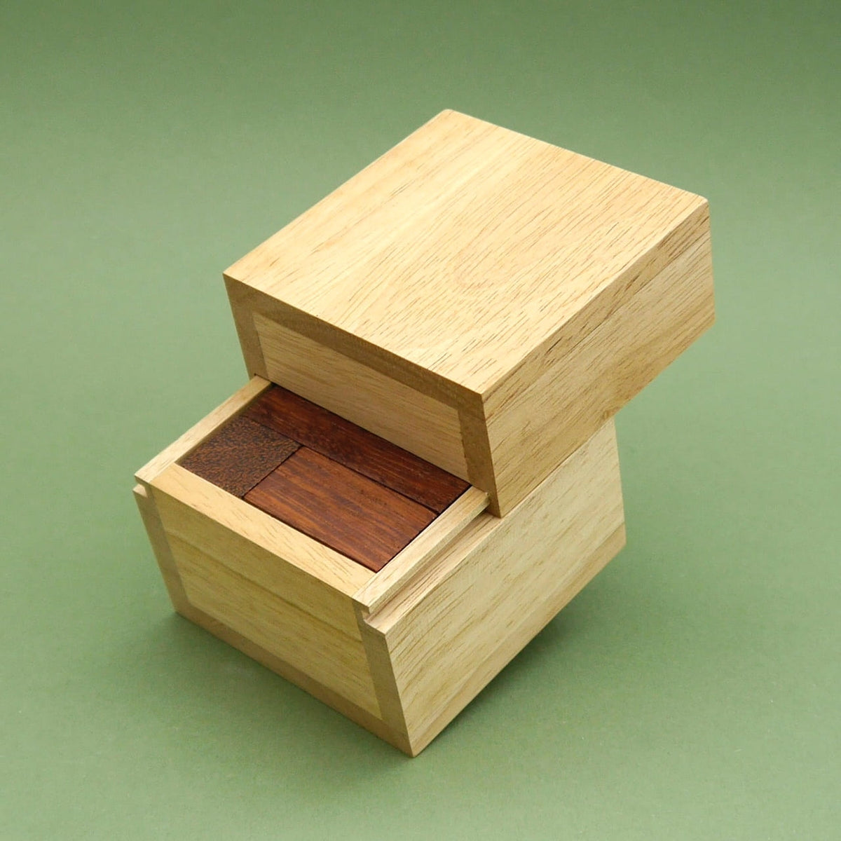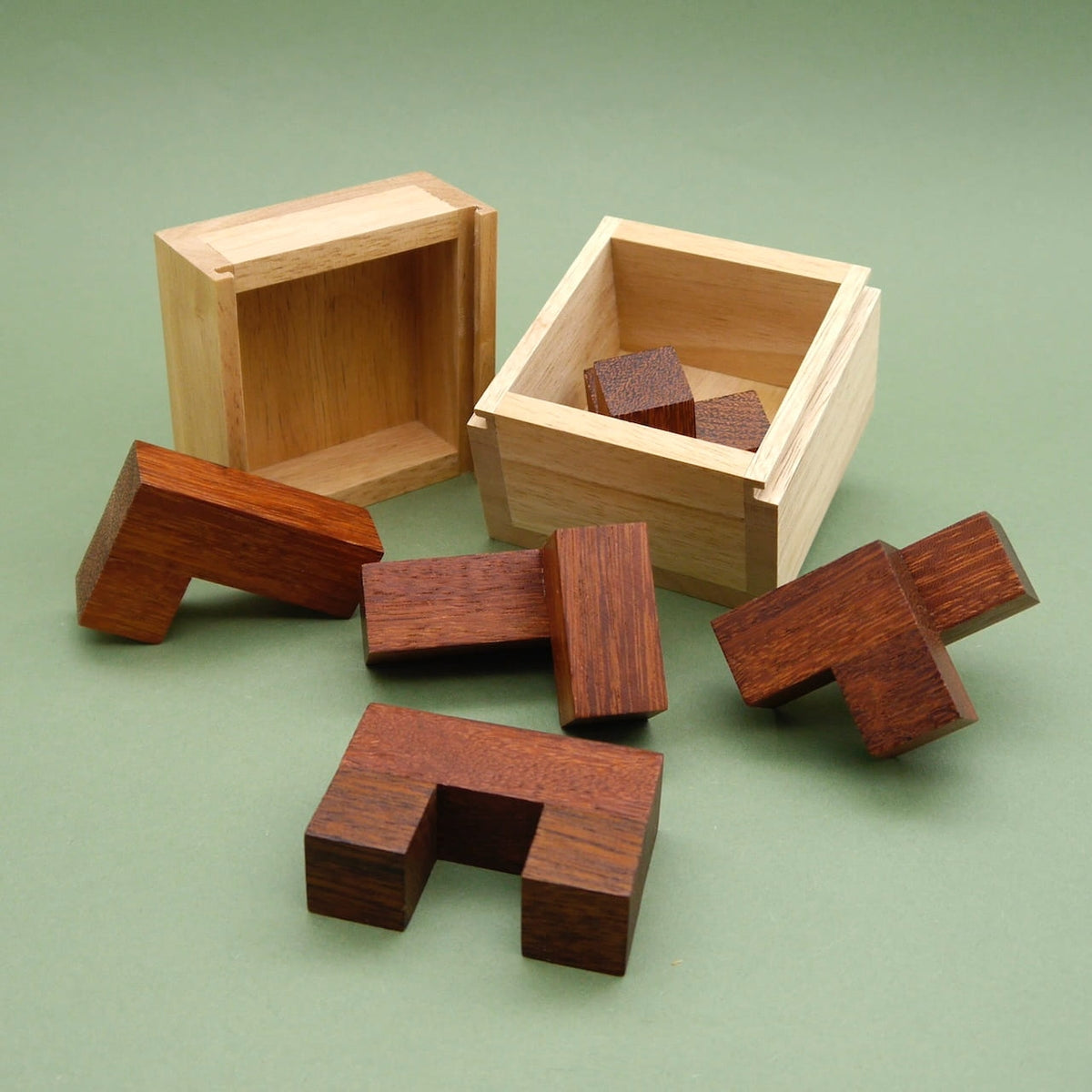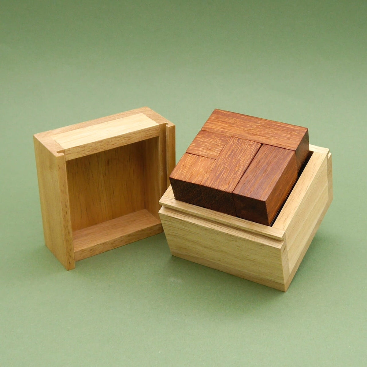 Inside the elegant wooden box are five precisely crafted wooden pieces. At first glance, they appear unassuming – but therein lies the ingenuity. The task seems simple: all the pieces must be placed in the box so that they fit perfectly and the lid closes completely. What sounds easy quickly reveals itself to be a complex challenge. This puzzle demands logical thinking, patience, and a strong spatial imagination.