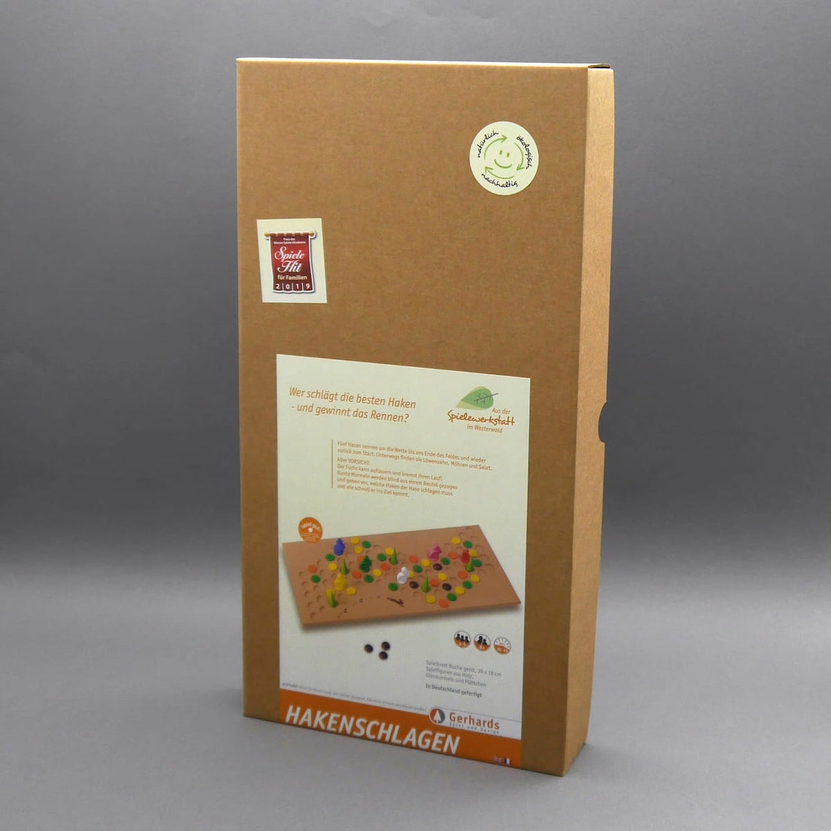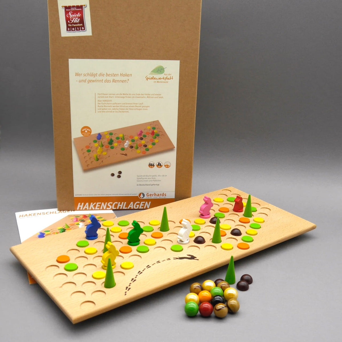 "Hook-Off" by Gerhards Spiel und Design is a lovingly crafted wooden family game that offers fun and excitement for all ages. In this high-quality children's game, up to five rabbits compete against each other on a detailed racetrack. The goal: to be the first to hop from the start through the finish line – and back again.