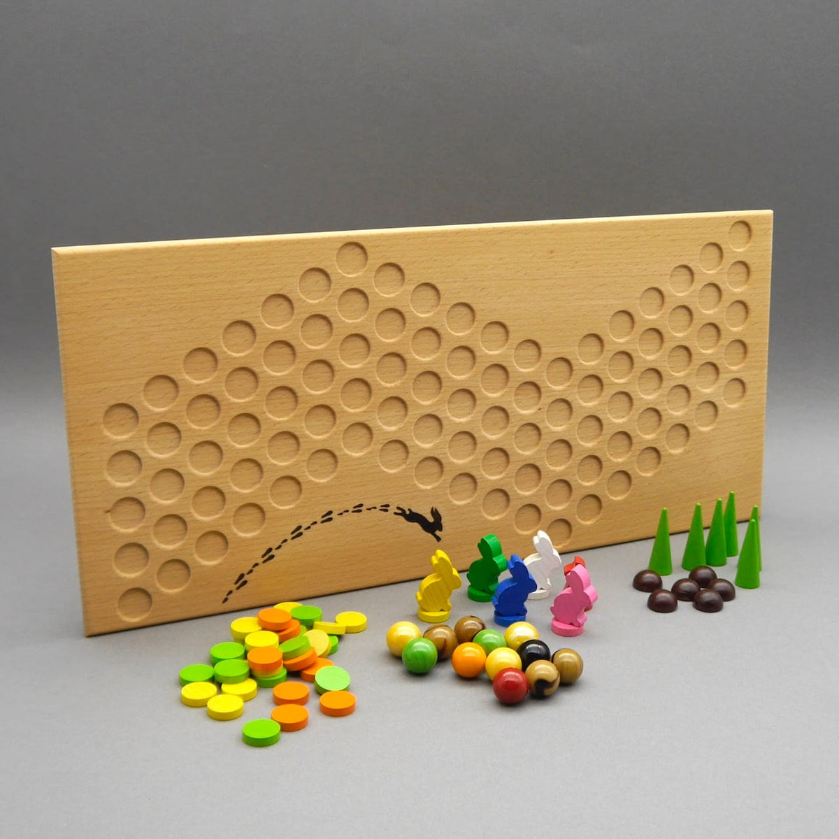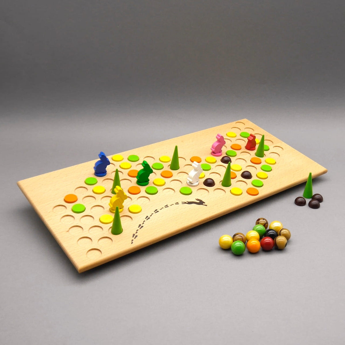The game board consists of lovingly crafted wooden boards, on which colorful tiles depicting carrots, lettuce, and dandelions are scattered. These spaces represent the culinary stops on the rabbits' journey. At the start of the game, these tiles are randomly placed, making each game new and varied. The rabbits strategically position themselves on the spaces and then begin their exciting race.