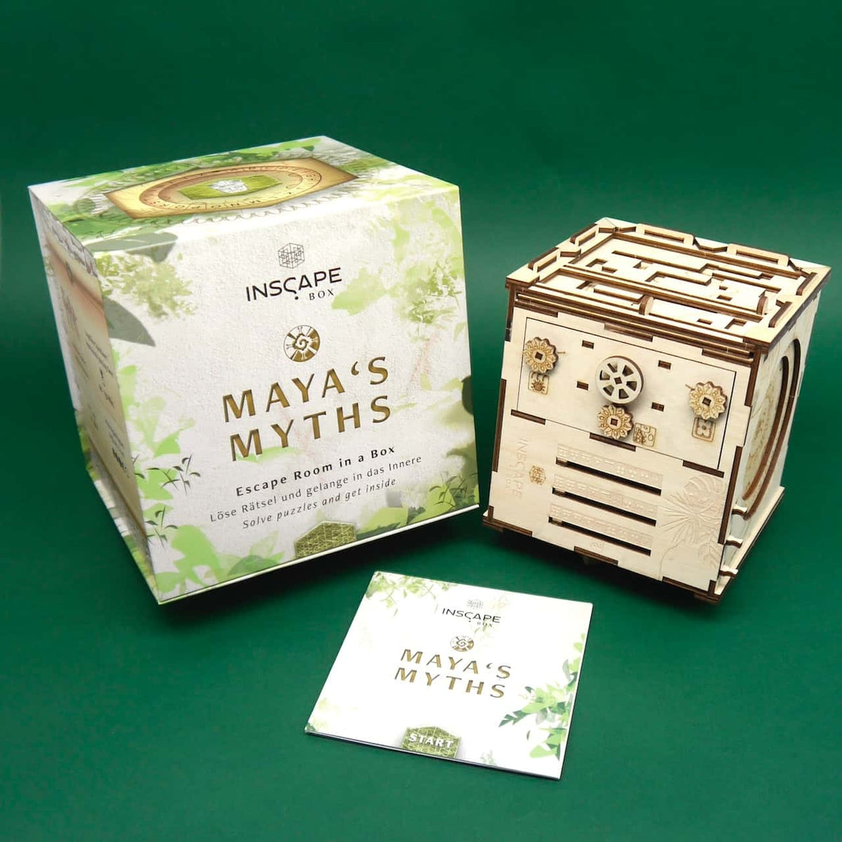 Sumérgete en el misterioso mundo maya con Cluebox MITOS MAYAS de INSCAPE BOX. Esta caja de rompecabezas 3D artesanal pone a prueba tu lógica y destreza. Tu misión: ¡Abrir la cámara funeraria, resolver los complejos rompecabezas y encontrar el tesoro maya escondido!