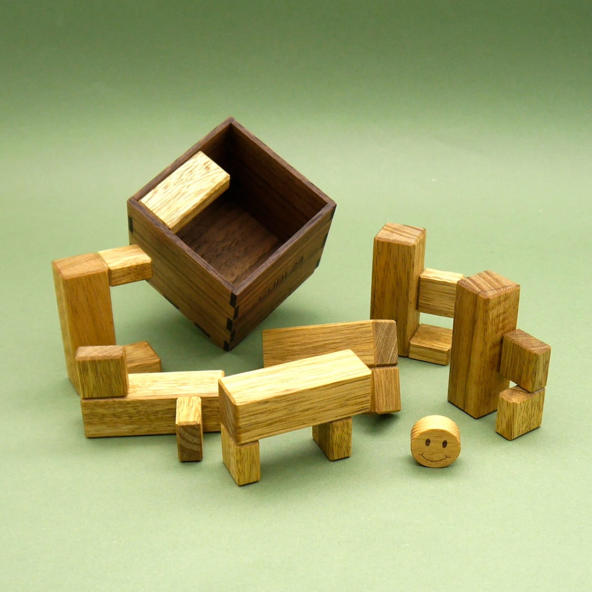 Die Aufgabe klingt zunächst simpel, entpuppt sich jedoch schnell als knifflige Herausforderung: Alle Holzwürfel und Puzzle-Elemente müssen exakt in die kompakte Knobelbox eingesetzt werden, ohne dass ein Teil über den Rand hinausragt. Zusätzlich muss der mit einem Smiley markierte Spielstein vollständig im Inneren verborgen bleiben. Doch die Box selbst erschwert die Lösung erheblich, da ein fest integriertes Element den verfügbaren Raum einschränkt und eine präzise Reihenfolge beim Einsetzen erfordert.